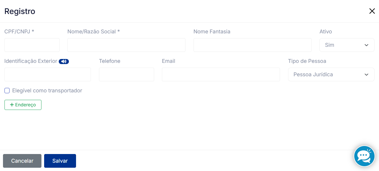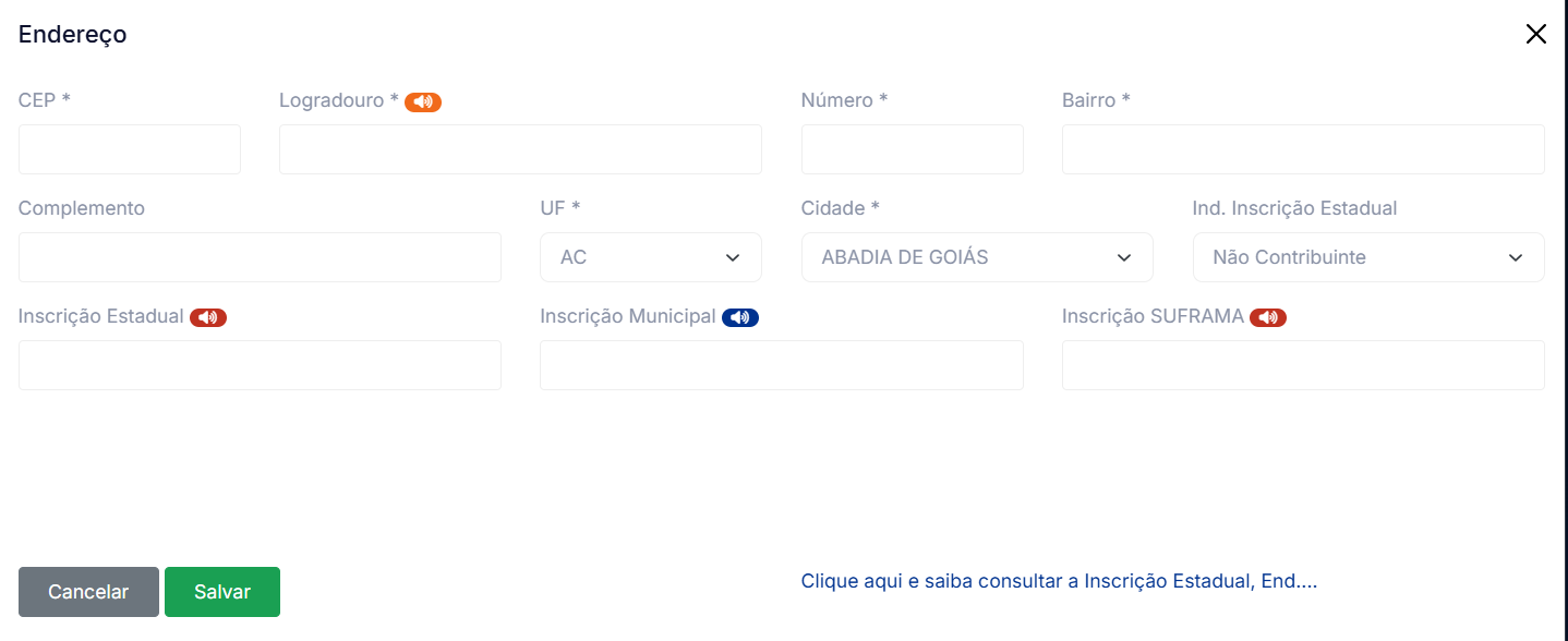 Os campos com * ficam como obrigatórios no preenchimento, em caso de cadastro com CPF será necessario clicar no botão + Endereço para adicionar o endereço manualmente.