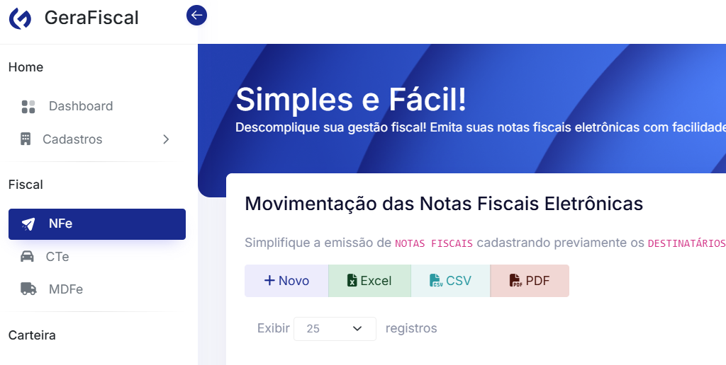 Gerencie suas Notas Fiscais Eletrônicas (NFes) de forma simples, rápida e eficiente. Este guia detalha como navegar pela tela de movimentação de NFes, cadastrar novas notas e exportar os dados.