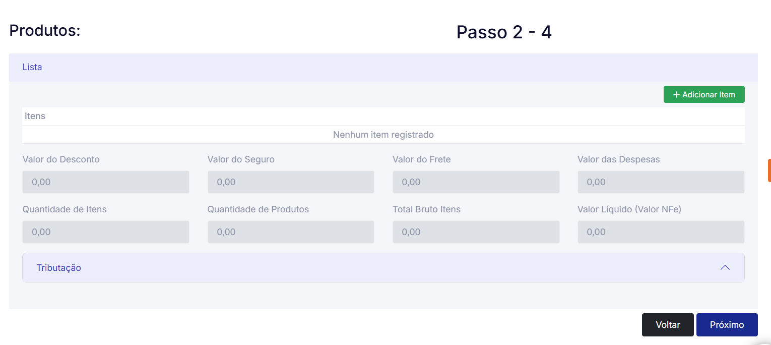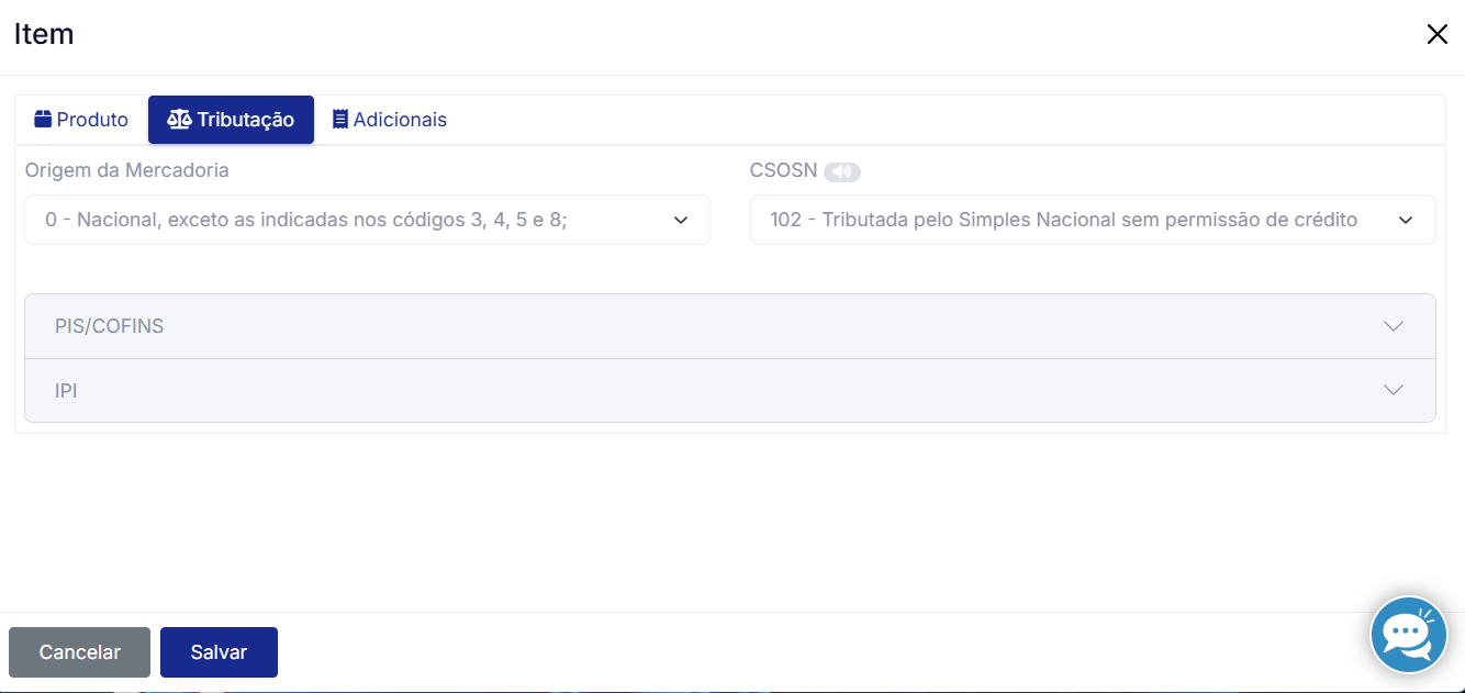 Na guia TRIBUTAÇÃO preencha os campos obrigatórios: