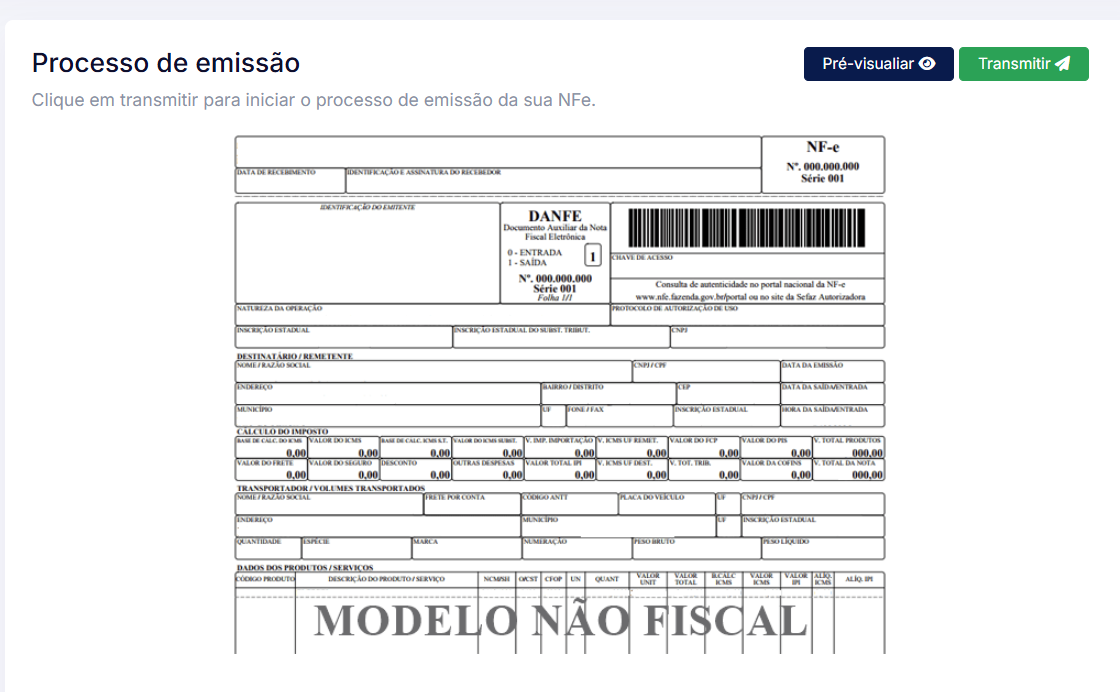 - Pré Visualiza: Será gerado uma nota com os dados sem valor fiscal.